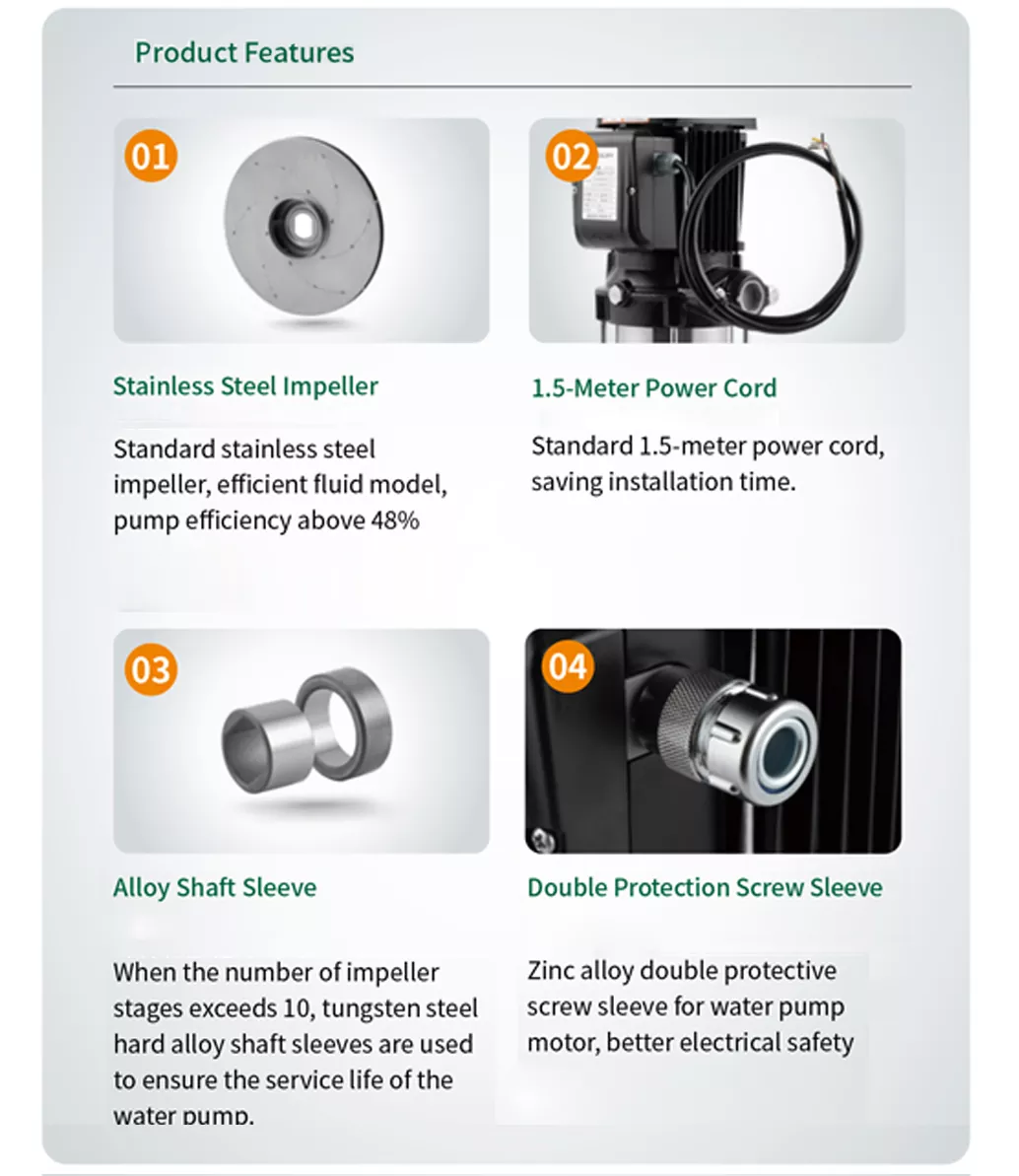 Is féidir an ceann caidéil a choigeartú trí líon na n-impellers a athrú chun freastal ar riachtanais éagsúla. Tá sé oiriúnach le haghaidh uisce glan nó leachtanna a bhfuil airíonna comhchosúla acu, agus is féidir samhlacha áirithe a shaincheapadh le haghaidh meáin chreimneach.